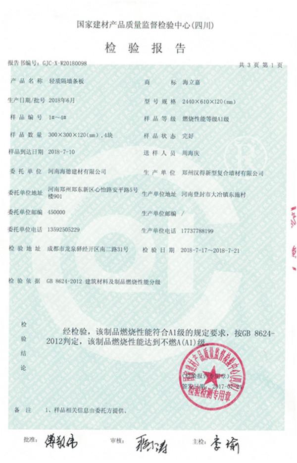 120mm輕質(zhì)隔墻板防火檢驗(yàn)報(bào)告